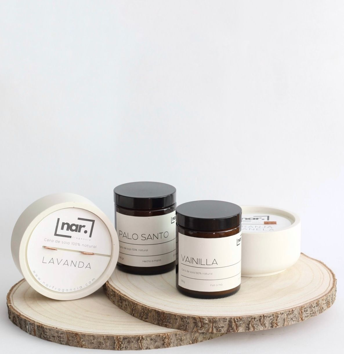 Todos nuestros productos están hechos a mano con materiales naturales y sostenibles. Usamos cera de soja 100% vegetal y libre de parafinas, fragancias veganas no tóxicas y envases reutilizables o producidos de forma artesanal con resina ecológica.